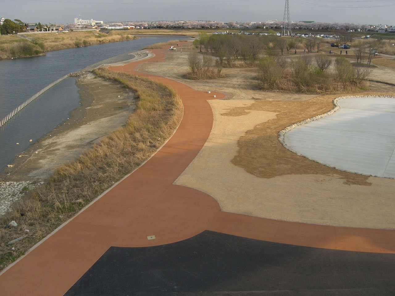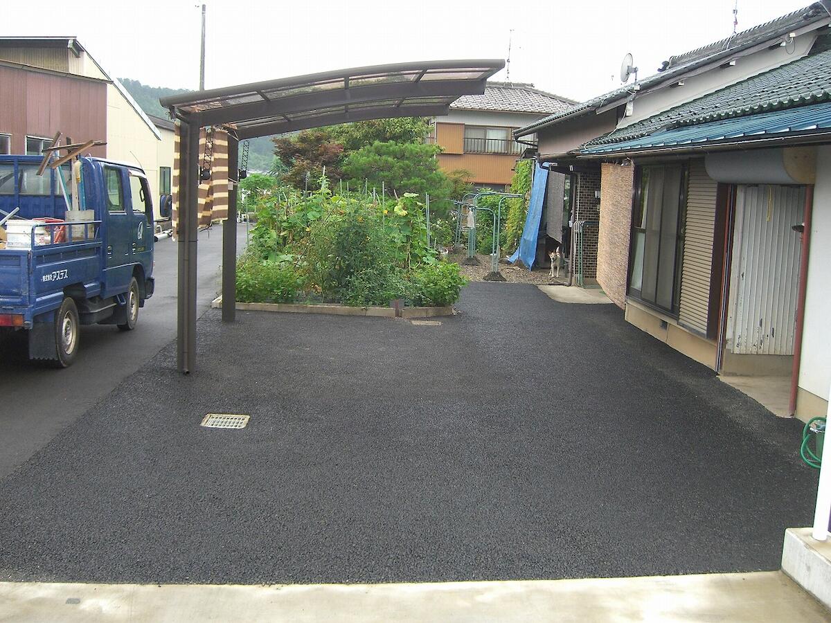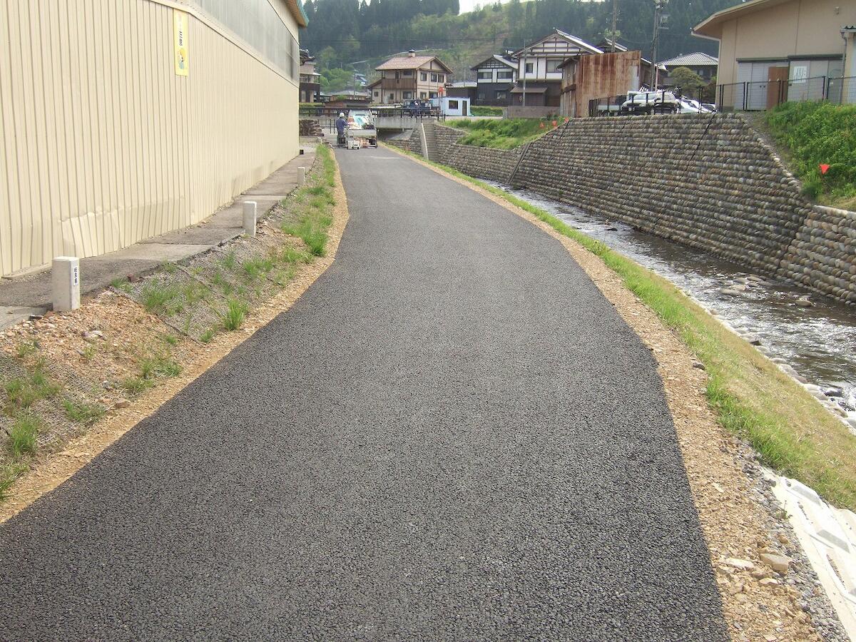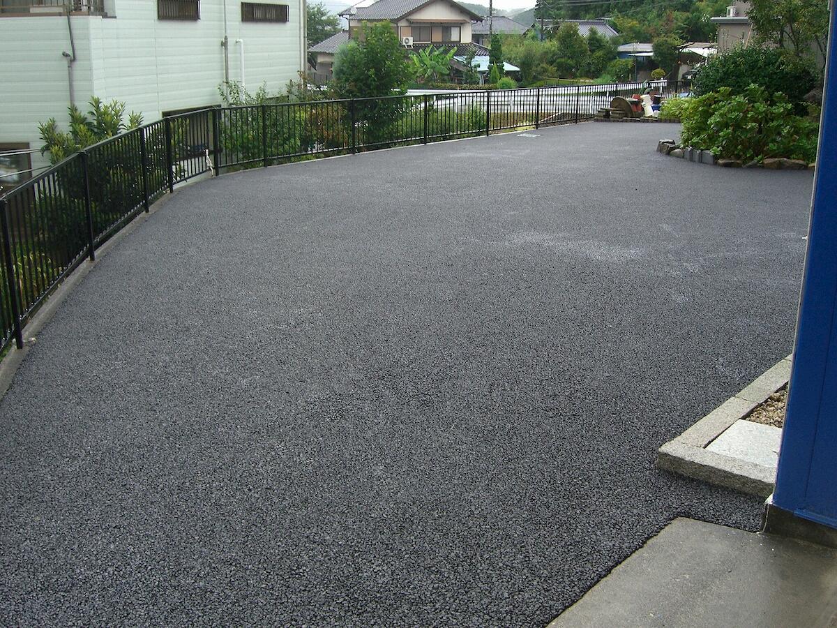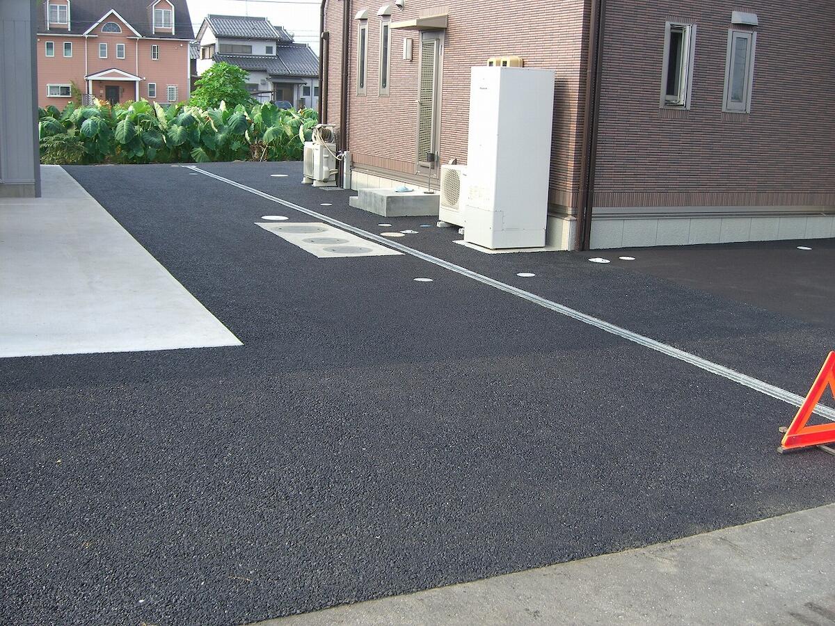 アスファルトを母体とし、骨材の夕食化と土による間詰めを行うことで、土舗装のような景観。