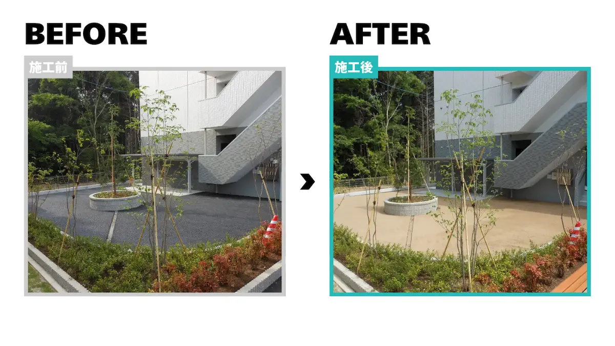 母体にアスファルト舗装の骨材の有色化と土による間詰めを行うことで実現できるため、短時間作業で新設の手間やコストの心配がありません。
